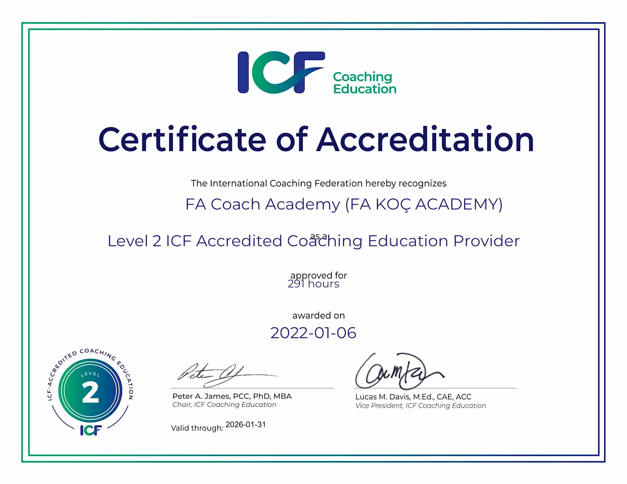 FA Koç Akademi tarafından bilimsel tekniklerle geliştirilen ve sürekli güncellenen 291 saatlik “Advanced Coaching Training” İleri Düzey Profesyonel Koçluk sertifika eğitimlerimizin tamamı Şubat 2013’den bu yana Koçluk mesleğinde en yüksek standartları belirleyen global kurum; International Coach Federation Level 2 akreditasyonuna sahiptir.